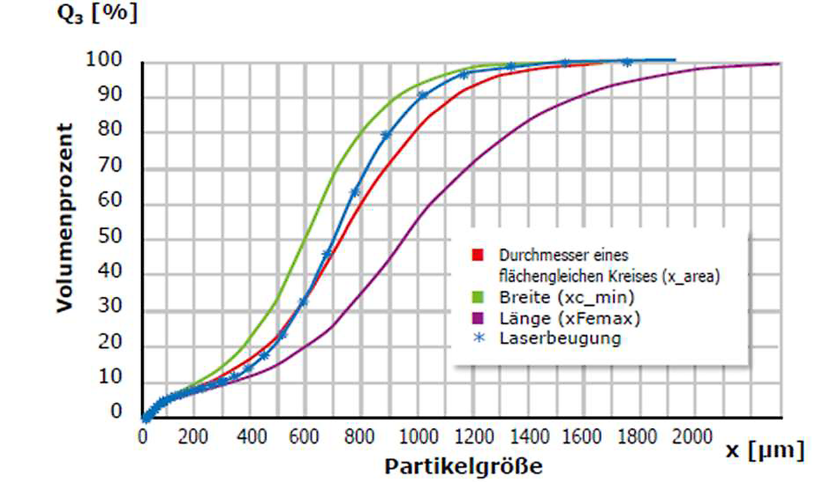 所有这些都代表了确定最终包含不超过 8 个数据点(= 使用的筛子数量)的粒度分布的高时间消耗。与动态图像分析的比较表明,筛分数据与尺寸定义 ”粒子宽度“。